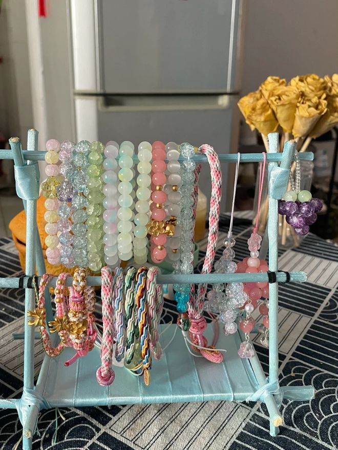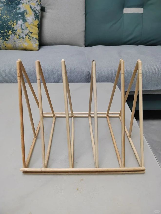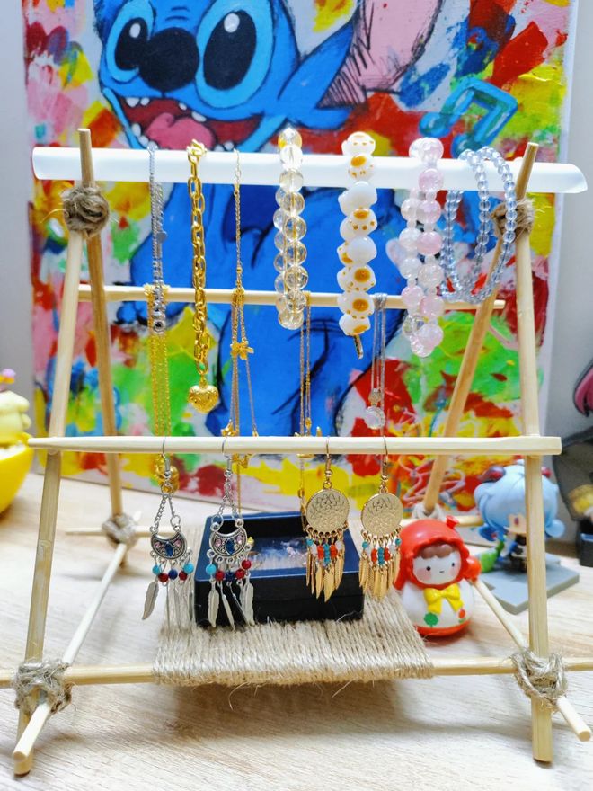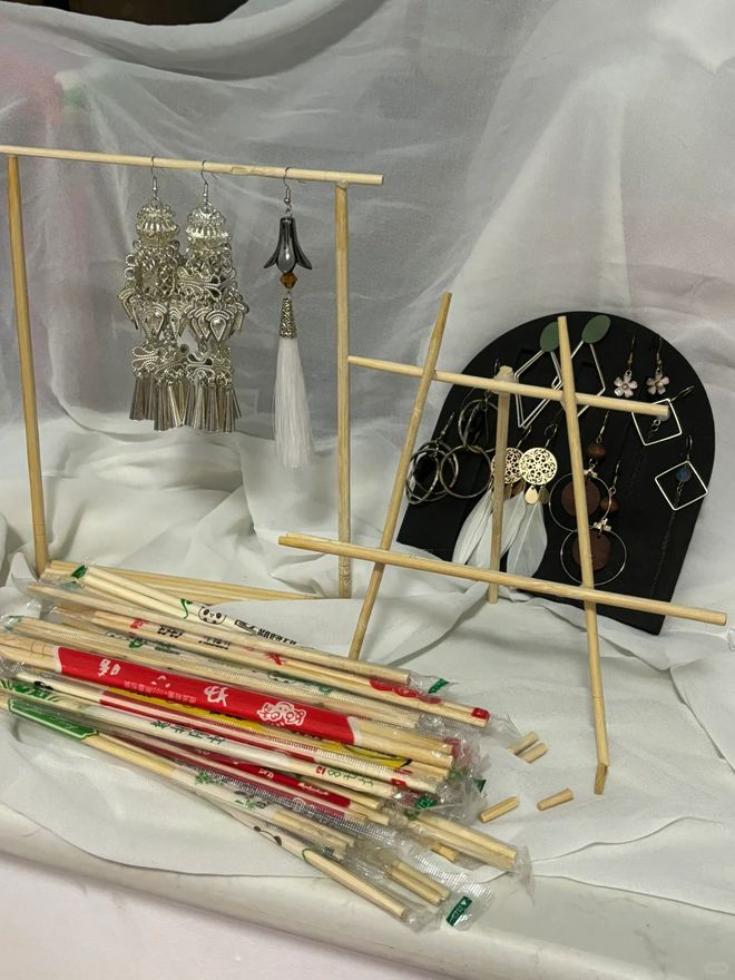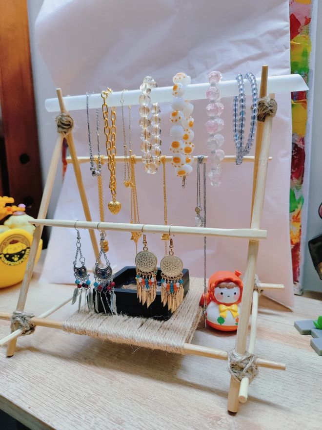 一次性筷子可以自制一个首饰收纳架,准备几双一次性筷子,然后将他们拆分像图中这样的方式使用麻绳搭建起来,