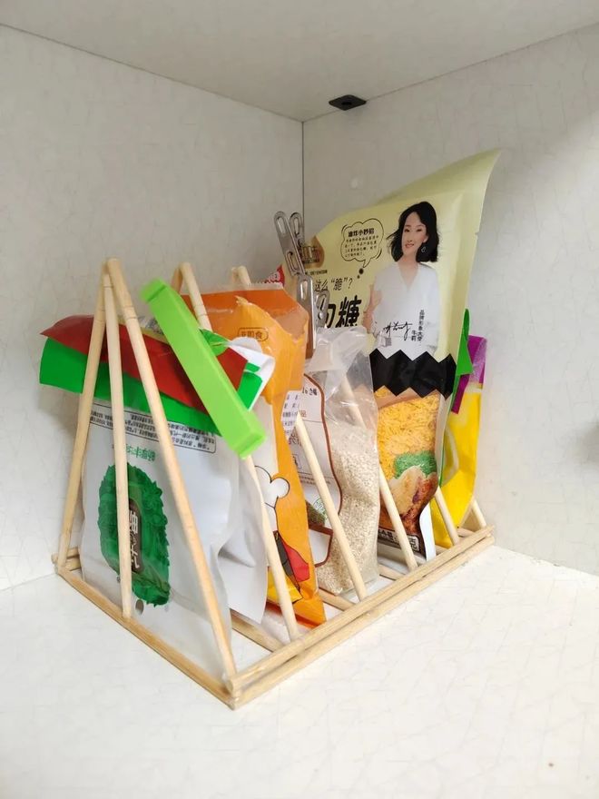 可以用一次性筷子像图中的方式搭建,然后使用热熔胶固定,用来收纳厨房调味料,又整齐又方便使用,而且放在橱柜当中也不占地方。