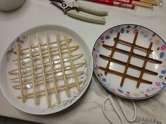 方法非常简单,只要将一次性筷子使用线绳固定就可以了,固定成网格形状,然后将长的地方剪掉,大小合适盘子就可以。