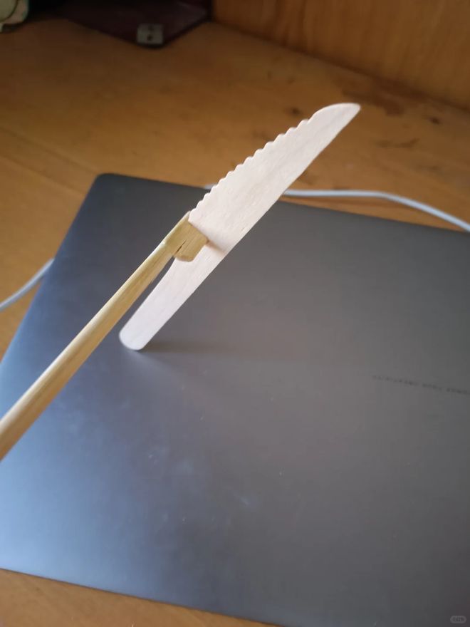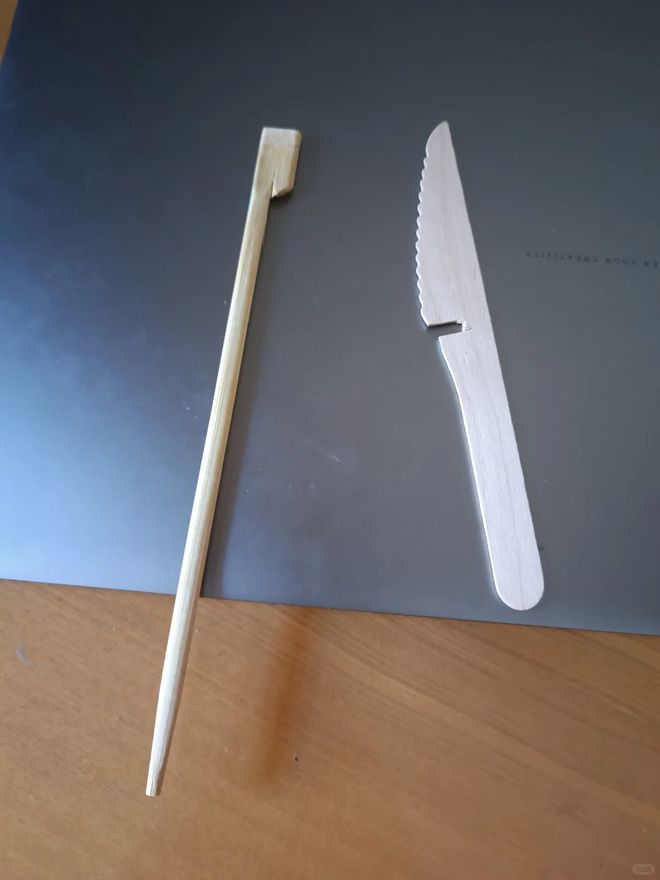 用一双一次性筷子和吃完蛋糕剩下的蛋糕刀像图中这样的方式结合在一起就变成了一个煎饼靶子,平常在家里可以摊鸡蛋饼,