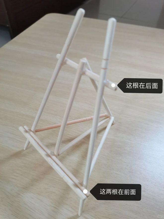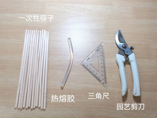 用一次性筷子可以制作一个手机支架,准备一次性筷子热熔胶三角尺和剪刀,左右两根完整的筷子,其余需要进行裁剪,按照图中这样的结构进行搭建,