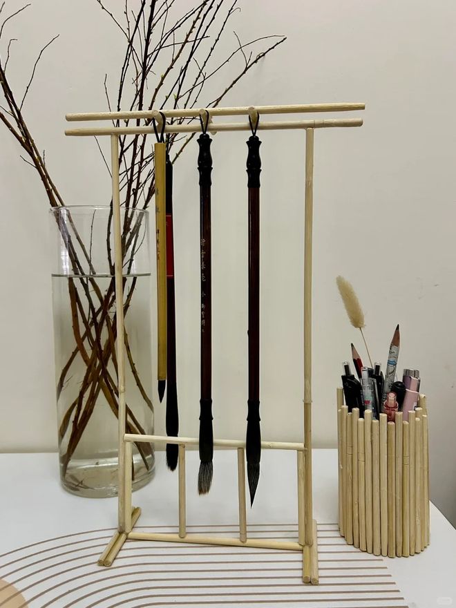 平时在家里练毛笔字,用完的毛笔没有立方挂,可以用一次性筷子制作一个简单的毛笔架,把一次性筷子像图中这样的方式搭建固定的地方使用热熔胶,这样用完的毛笔就可以放在上面悬挂了,毫无违和感。
