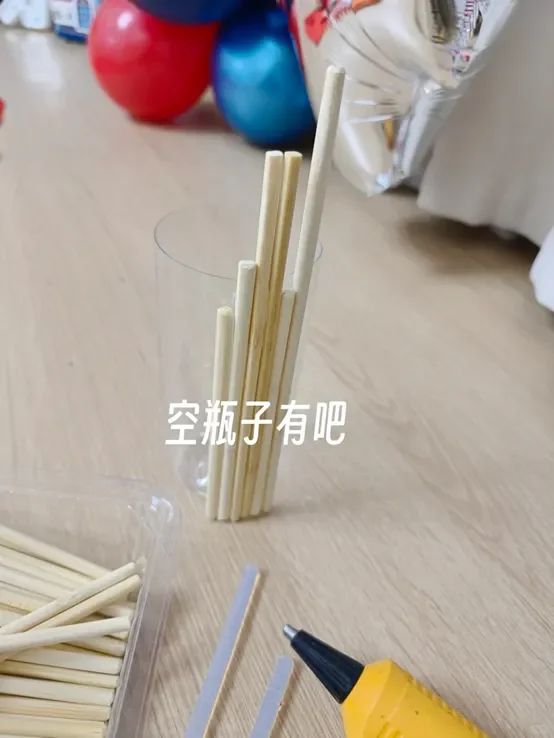 平时喝完饮料,剩下的空瓶子也可以当做花瓶,但是颜值太低,用一次性筷子装饰一下,立马不一样了,可以将一次性筷子裁剪成长短不一样的,