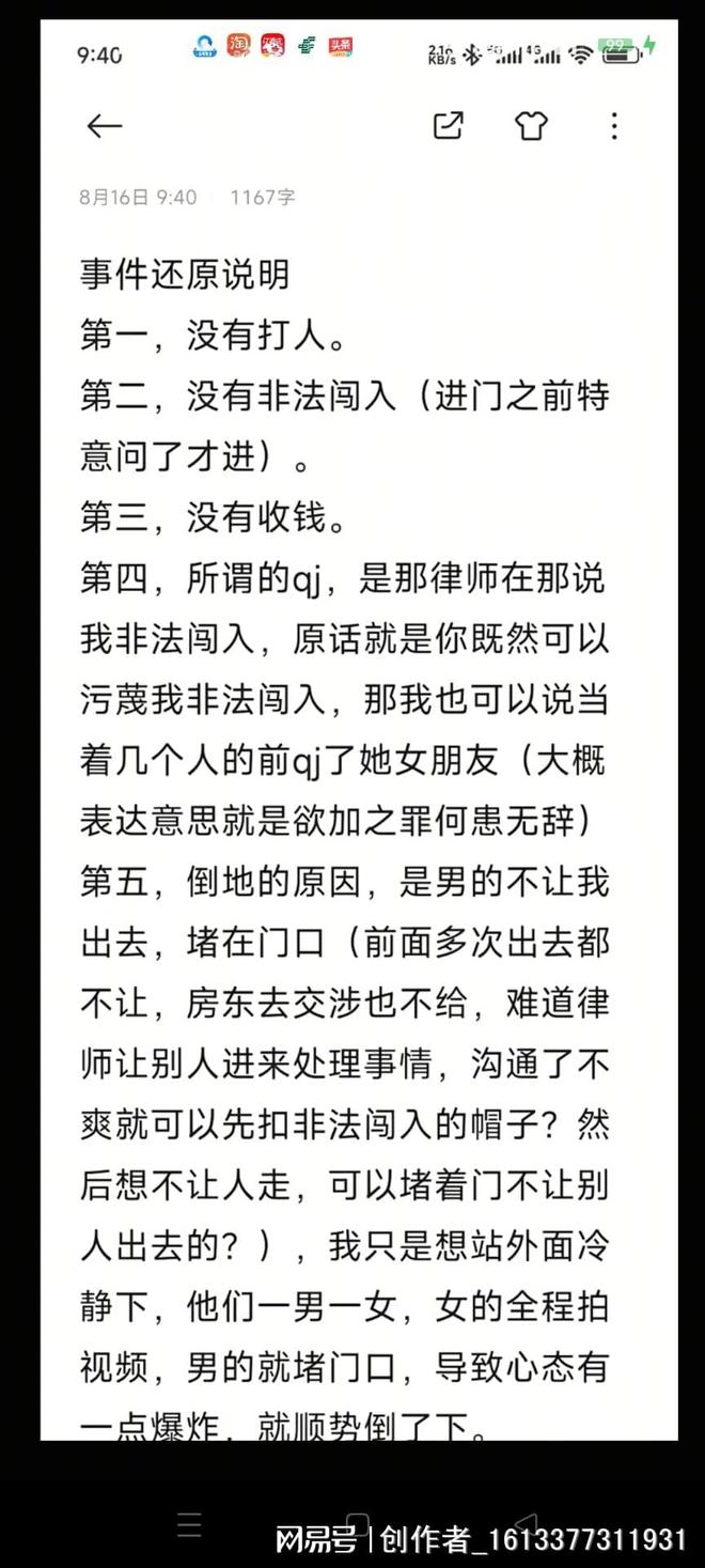 第五,倒地的原因,是男的不让我出去,堵在门口,我只想站在外面冷静下,他们一男一女,女的全程拍视频,男的就堵门口,导致心态有一点爆炸,就顺势倒下了。第六,他们是男女朋友关系,一直住在这个房子里,男的当面喊女的老婆,宝宝之类,在抖音上女的改成是她喊过来的朋友。”